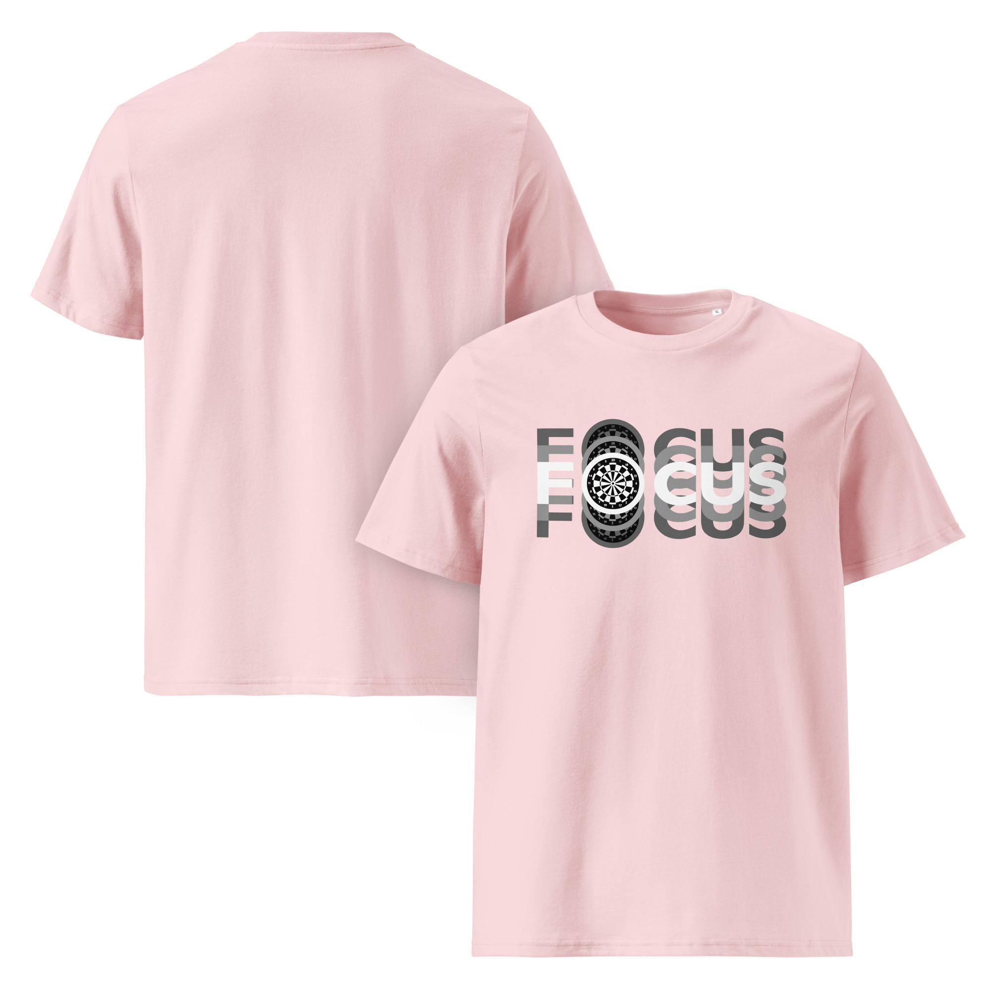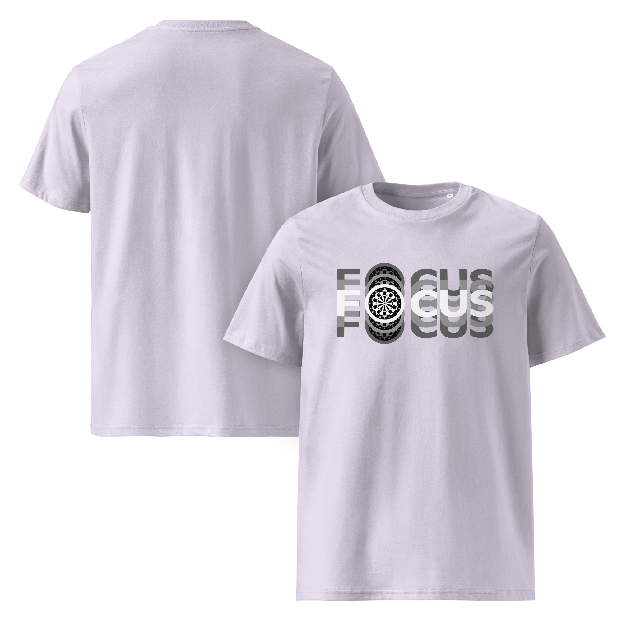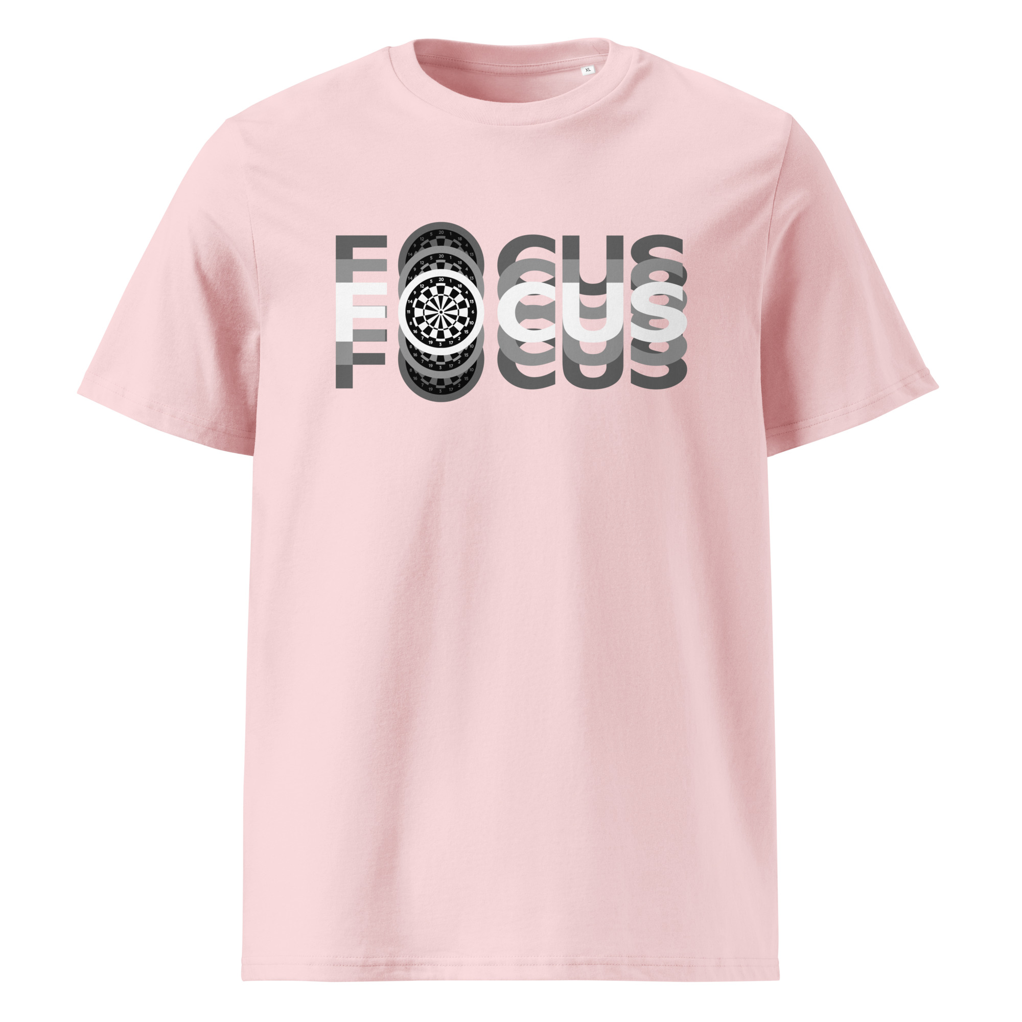 Dart T-Shirt für Spielerinnen, die mit Klarheit und Präzision werfen.Das moderne „FOCUS“-Design mit wiederholter Schrift und zentralem Dartboard symbolisiert mentale Stärke, Ruhe und absolute Zielorientierung.